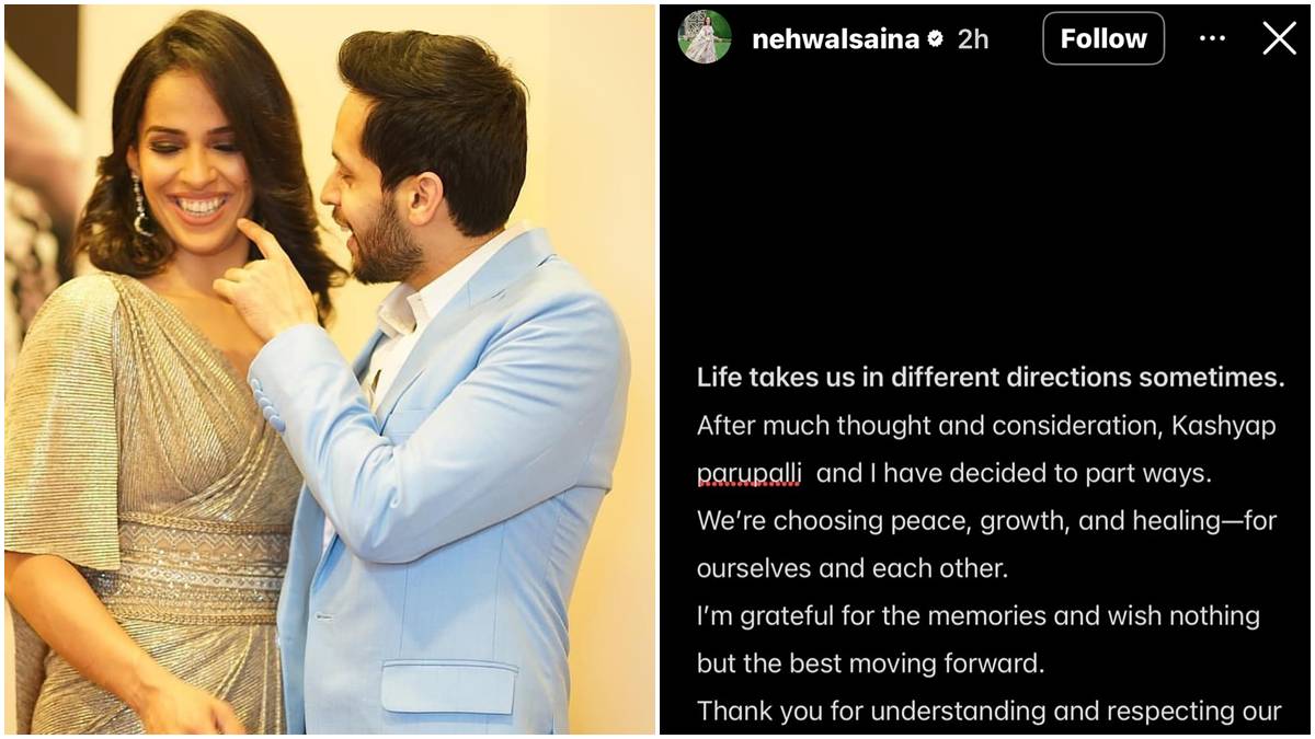 Olympic bronze medalist and badminton star Saina Nehwal has announced her separation from husband and fellow shuttler Parupalli Kashyap. The news was shared by Nehwal via her Instagram Story on Sunday, where she opened up about the personal decision.