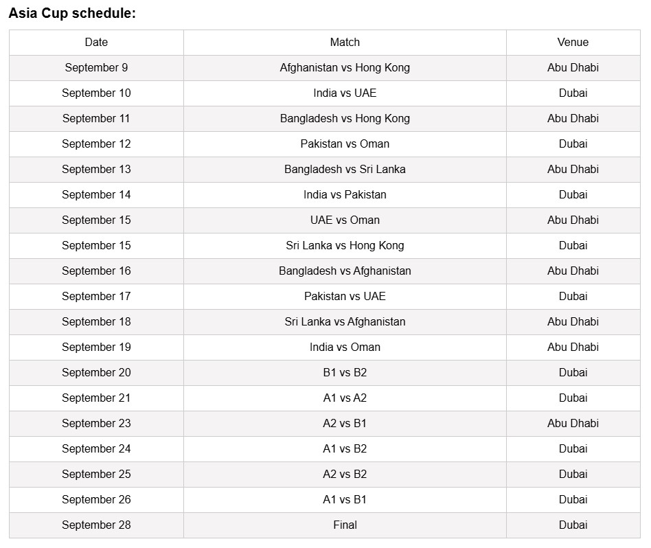 A total of 19 T20 International matches are set to be played, featuring eight teams divided into two groups. Notably, 11 matches, including the marquee India vs Pakistan clash on September 14 and the tournament final on September 28, will be played at the Dubai stadium, while Abu Dhabi will host 8 matches, including a Super Four fixture on September 23.