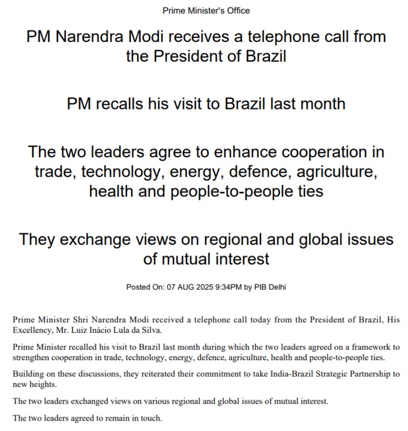Amid escalating global trade tensions triggered by U.S. President Donald Trump’s 50% tariff hikes, Brazilian President Luiz Inácio Lula da Silva held a phone call with Indian Prime Minister Narendra Modi on Thursday (August 7, 2025). During the conversation, both leaders reaffirmed their commitment to deepening the India-Brazil strategic partnership across critical sectors.