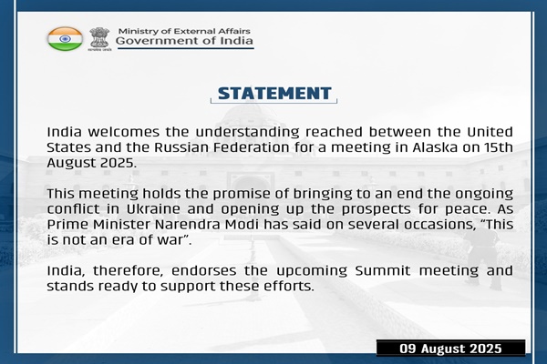 The Ministry of External Affairs stated: “We appreciate the agreement reached between the United States and the Russian Federation for a meeting in Alaska on August 15, 2025.”