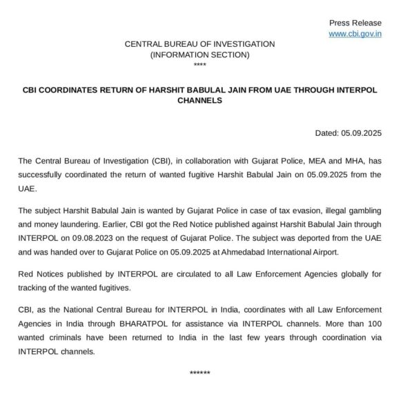 New Delhi: In a major success for Indian investigative agencies, fugitive Harshit Babulal Jain has been deported from the UAE and handed over to Gujarat Police. Jain, wanted in cases of tax evasion, illegal gambling, and money laundering, was brought back to India on 5 September 2025 through coordinated efforts by the Central Bureau of Investigation (CBI), the Ministry of External Affairs (MEA), the Ministry of Home Affairs (MHA), and Gujarat Police.