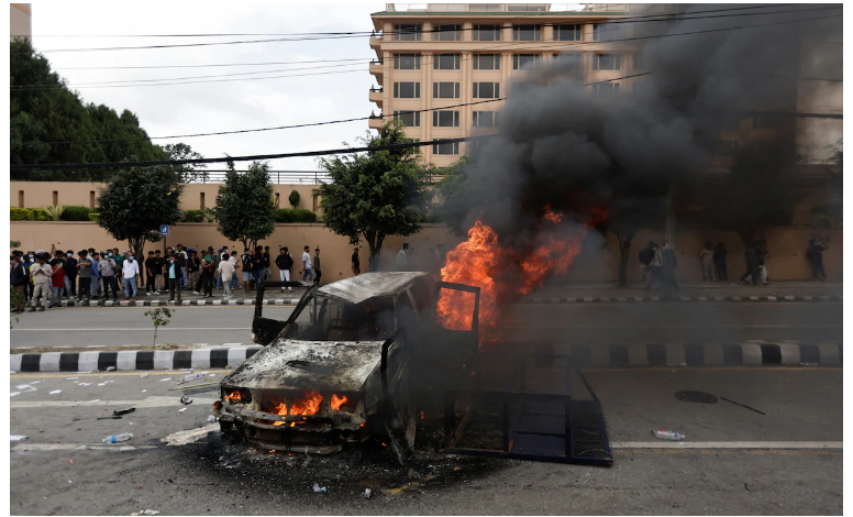 Protesters in Kalanki burned tyres, blocked roads, and raised slogans such as “KP Chor, Desh Chhod” (Oli is a thief, quit the country). Several houses of ministers, including the residence of President Ram Chandra Poudel, came under attack, while demonstrators vandalised the home of former Prime Minister Pushpa Kamal Dahal ‘Prachanda’ in Lalitpur and staged demonstrations outside Sher Bahadur Deuba’s house in Kathmandu. Poudel’s residence was also set ablaze.