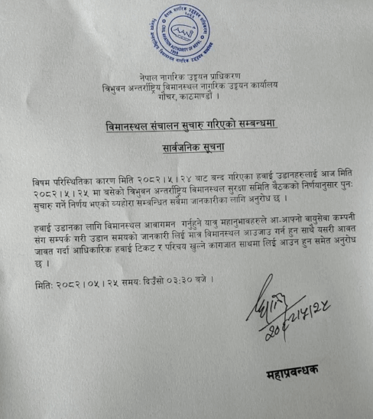 Kathmandu: Kathmandu’s Tribhuvan International Airport reopened on Wednesday, lifting the flight suspension imposed earlier due to the ongoing unrest. The Civil Aviation Authority of Nepal announced that flight operations were restored following a security committee meeting and urged passengers to contact their airlines for updated schedules while carrying valid tickets and identification.