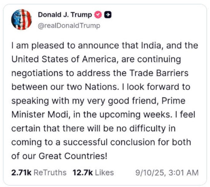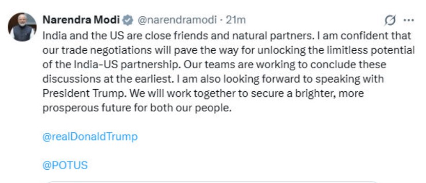 In a post on X (formerly Twitter), PM Modi struck a similarly optimistic tone. Describing the United States as a “close friend” and a “natural partner,” Modi stated that he is confident these negotiations “will pave the way for unlocking the limitless potential of the India–US partnership.” He added that both countries’ teams are “working to conclude these discussions at the earliest.” Modi also looked forward to speaking directly with President Trump and emphasized their shared goal of securing a “brighter, more prosperous future for both our people.”