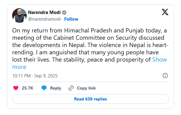 Prime Minister Narendra Modi on Tuesday expressed deep concern over the escalating unrest in Nepal, where violent anti-government protests have claimed several lives, mostly of young demonstrators. After reviewing rain-related damages in Himachal Pradesh and Punjab, Modi chaired a Cabinet Committee on Security meeting to assess the situation in the neighbouring country.