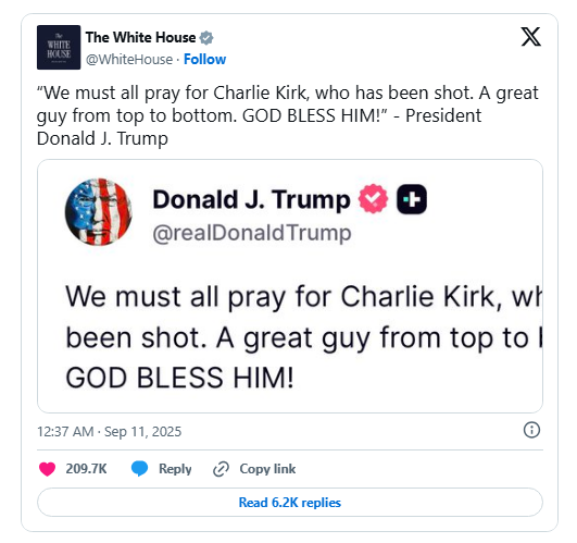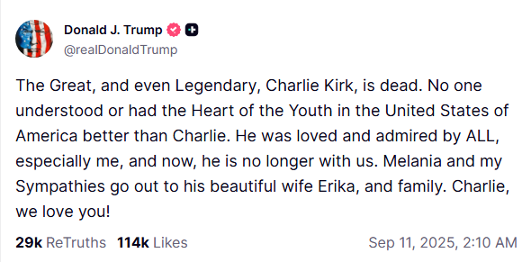 Kirk’s visit had already drawn controversy, with nearly 1,000 people signing a petition to cancel his appearance over his polarizing views, but the university upheld its commitment to free speech and allowed the event to proceed. President Trump confirmed Kirk’s death in a Truth Social post, calling him “Great, and even Legendary” and praising his connection with America’s youth.
