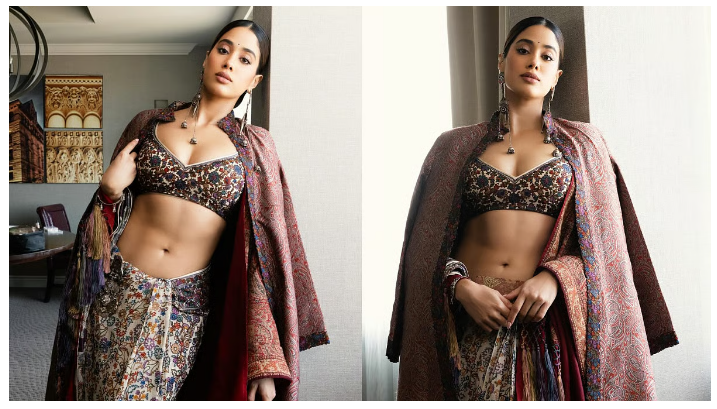 For her first appearance, Janhvi wore a resham saree by Abu Jani Sandeep Khosla, inspired by intricate jamavar weaves. She elevated the traditional drape with a vintage 1980s men’s jamavar jacket, upcycled and re-embroidered to create a contemporary red-carpet look.