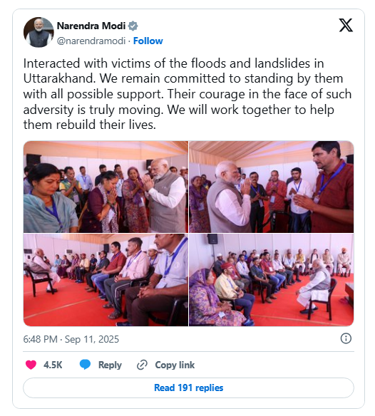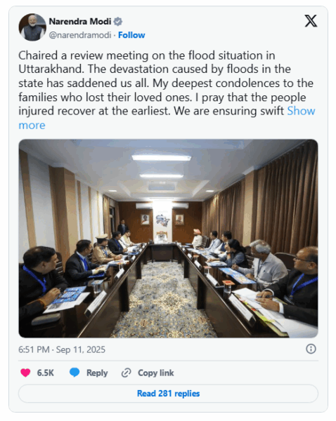 On Thursday, although bad weather prevented an aerial survey of the flood-affected areas, PM Modi held a detailed review meeting with CM Dhami and senior officials in Dehradun to assess relief, rehabilitation, and reconstruction plans.