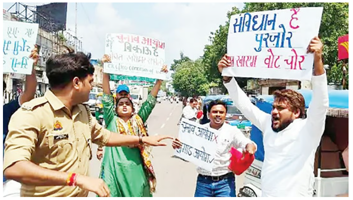 Protesters carried placards claiming that lakhs of names were removed from voter lists before the Bihar polls, and a similar exercise is now being attempted in Uttar Pradesh.