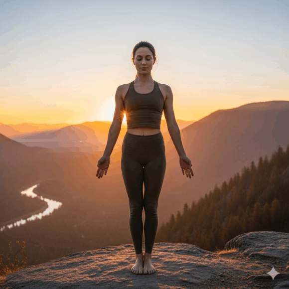 Stand tall with feet together, palms at the heart centre, and shoulders relaxed. This simple pose builds awareness of posture and sets an intention for the practice.