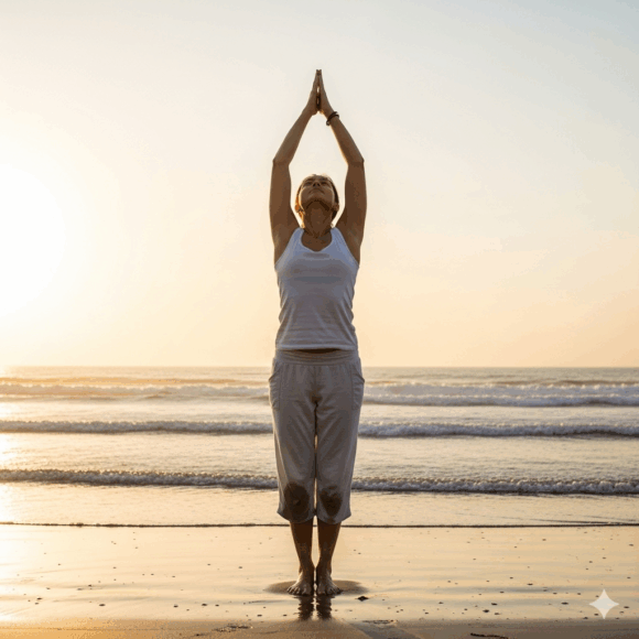 Upward Salute (Urdhva Hastasana) Inhale deeply, raise arms overhead, and gently arch back. This opens the chest and lungs while improving blood circulation.