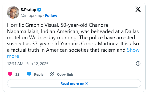 In a horrifying incident in Dallas, Texas, a 50-year-old Indian-origin motel manager, Chandra Mouli “Bob” Nagamallaiah, was brutally beheaded in front of his wife and 18-year-old son on Wednesday.