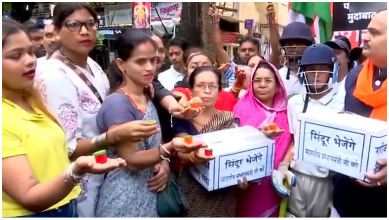 The protest came a day after party chief Uddhav Thackeray called for women across Maharashtra to send sindoor from every household to Prime Minister Narendra Modi, symbolizing their objection to India playing against Pakistan.