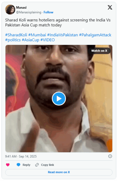 Shiv Sena (UBT) leader Sharad Koli addressed the media, calling on hoteliers in Maharashtra to honour the grief of families who lost loved ones in the recent Pahalgam terror attack. “Terrorists in Pakistan shot Indians in the head, killing them brutally. Still, a match is being played with Pakistan,” Koli said. He warned, “No hotel owner or operator should telecast this match. If we love India, we must boycott it. If anyone shows the match, their television screens will be smashed, and the responsibility will lie with them.”