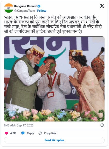 Kangana Ranaut shared a heartfelt post along with a picture of PM Modi, writing, “By embracing the mantra of ‘Sabka Saath, Sabka Vikas,’ hearty congratulations and best wishes to the true son of Maa Bharti, the country’s most popular leader, Prime Minister Narendra Modi ji.”