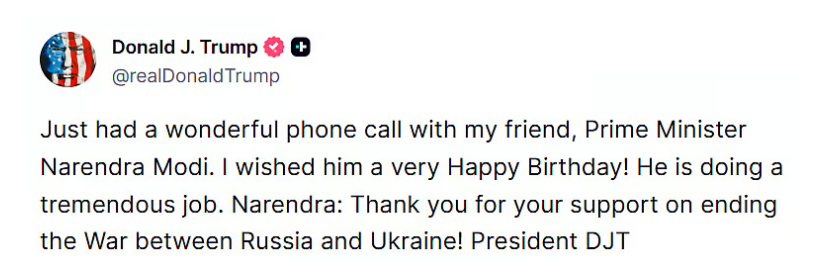 Writing on Truth Social, Trump revealed that Modi thanked him for supporting initiatives aimed at ending the ongoing Russia-Ukraine war.