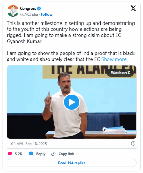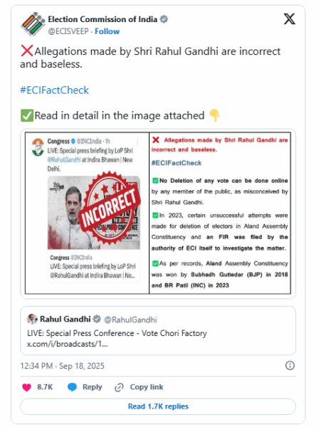 Gandhi had cited alleged irregularities in Karnataka’s Aland constituency as an example of what he called the “murder of Indian democracy.” The EC acknowledged that there had been attempts to fraudulently delete votes in 2023 but confirmed that the deletions were unsuccessful. The Commission said it had proactively filed an FIR to initiate a police investigation into the matter.