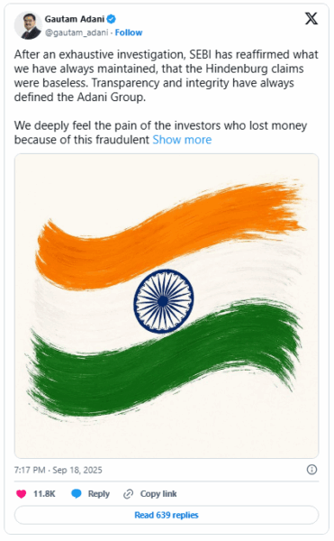 After an exhaustive investigation, SEBI has reaffirmed what we have always maintained—that the Hindenburg claims were baseless. Transparency and integrity have always defined the Adani Group. We deeply feel the pain of the investors who lost money because of this fraudulent and motivated report. Those who spread false narratives owe the nation an apology,” he wrote.