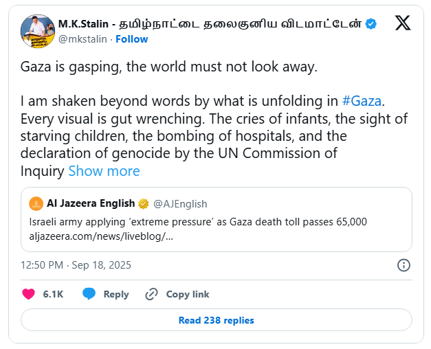 “When innocent lives are being crushed in this way, silence is not an option. Every conscience must rise. India must speak firmly, the world must unite, and we must act to end this horror now,” Stalin said, urging global leaders to intervene and stop the escalating violence.