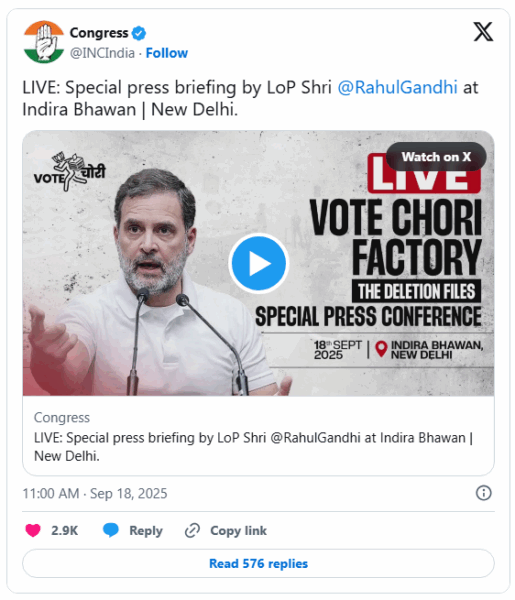 This explosive press conference follows Gandhi’s earlier allegation that over one lakh votes were stolen in Karnataka’s Mahadevapura constituency during the 2024 elections.
