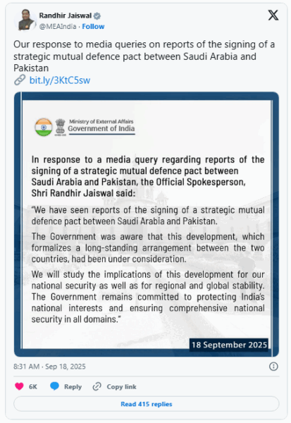 Reacting to the development, the Ministry of External Affairs (MEA) said, “We have seen reports of the signing of a strategic mutual Defence pact between Saudi Arabia and Pakistan.