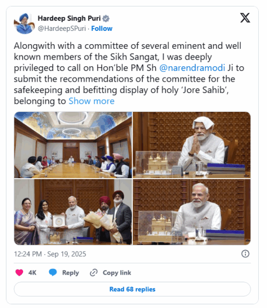 Union Minister Hardeep Singh Puri, who attended the meeting, also expressed his gratitude, writing, “Along with a committee of several eminent and well-known members of the Sikh Sangat, I was deeply privileged to call on Hon’ble PM @narendramodi Ji to submit the recommendations of the committee for the safekeeping and befitting display of holy ‘Jore Sahib’, belonging to the founder of Khalsa Panth, Dasam Pita Sri Guru Gobind Singh Ji Maharaj and his wife Mata Sahib Kaur Ji.”