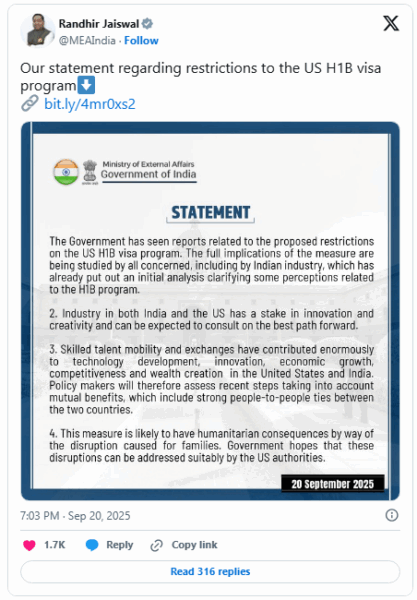 The MEA cautioned that the steep fee could create humanitarian challenges, particularly for families of H-1B workers. “This measure is likely to have humanitarian consequences by way of the disruption caused for families. Government hopes that these disruptions can be addressed suitably by the US authorities,” the statement read.