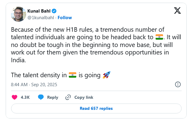 Bahl’s post comes in the wake of US President Donald Trump’s decision to increase H‑1B visa fees to USD 1,00,000, a move expected to impact many Indian professionals aspiring to work in the US.