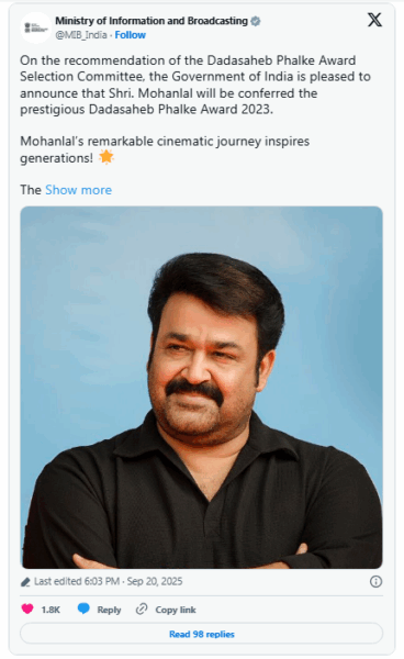 The Ministry of Information and Broadcasting announced the decision on X (formerly Twitter), stating, “On the recommendation of the Dadasaheb Phalke Award Selection Committee, the Government of India is pleased to announce that Shri Mohanlal will be conferred the prestigious Dadasaheb Phalke Award 2023.”