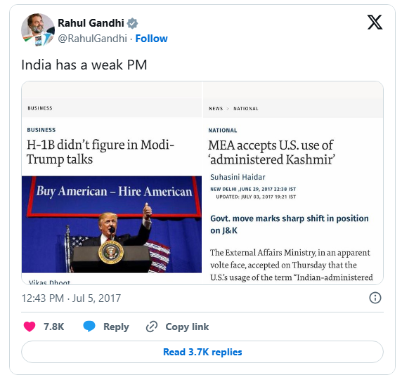 Rahul Gandhi, Leader of Opposition in the Lok Sabha, called Prime Minister Modi “weak” and reiterated his earlier criticism from 2017, questioning why the Prime Minister had not addressed the H-1B visa issue with then-US President Trump.