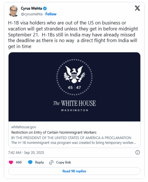 “H-1B visa holders who are out of the US on business or vacation will get stranded unless they enter before midnight September 21. Those still in India may already have missed the deadline since no direct flight can reach in time,” noted New York-based immigration attorney Cyrus Mehta in a post on X.