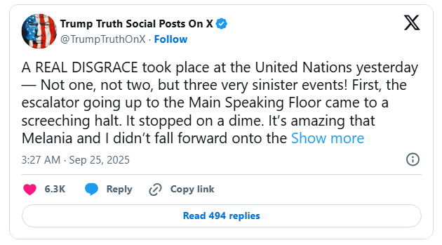 In a fiery post on Truth Social, Trump said, “A REAL DISGRACE took place at the United Nations yesterday — not one, not two, but three very sinister events!” He claimed that the escalator incident could have led to serious injury, stating that he and Melania narrowly avoided falling forward only because they held the handrails.