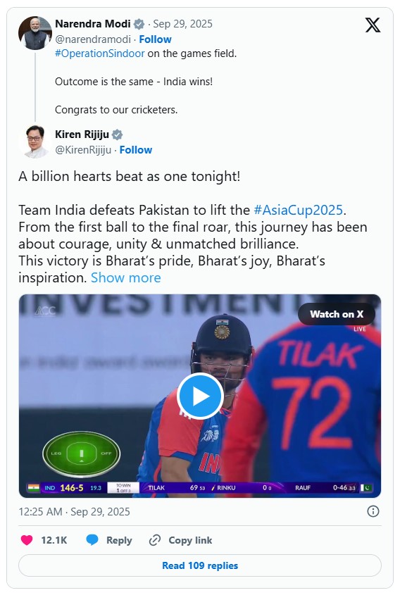 The Prime Minister’s tweet carried weight well beyond cricket. Coming a day after India refused to accept the Asia Cup trophy from ACC chairman and Pakistan minister Mohsin Naqvi, Modi’s words signaled that the victory was being viewed as more than just a sporting milestone.