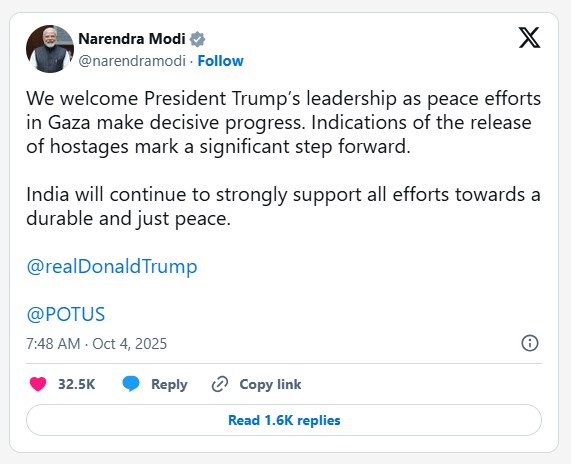 In a message posted on social media, Modi said India “welcomes President Trump’s leadership as peace efforts in Gaza make decisive progress.” He pointed especially to indications that hostages may be released as “a significant step forward.” He reaffirmed India’s commitment to backing “all efforts towards a durable and just peace.”